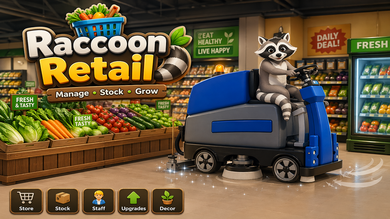 Join the hilarious simulation game called Raccoon Retail, where you control a hardworking panda cleaning up a chaotic supermarket. Develop your store through your own realistic strategies!